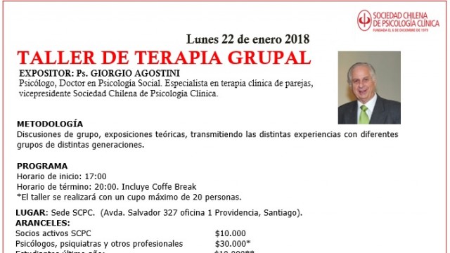 Dictan Taller de Terapia Grupal con Ps. Giorgio Agostini: Lunes 22 de enero Estimados socios: Les informamos la realización del siguiente taller de perfeccionamiento: TALLER DE TERAPIA GRUPAL EXPOSITOR: Ps. GIORGIO AGOSTINI V. Psicólogo, Doctor en Psicología Social. Especialista en terapia clínica de parejas, vicepresidente Sociedad Chilena de Psicología Clínica. Se constituirá un grupo de profesionales interesados en conocer técnicas de grupo con distintos… Read More